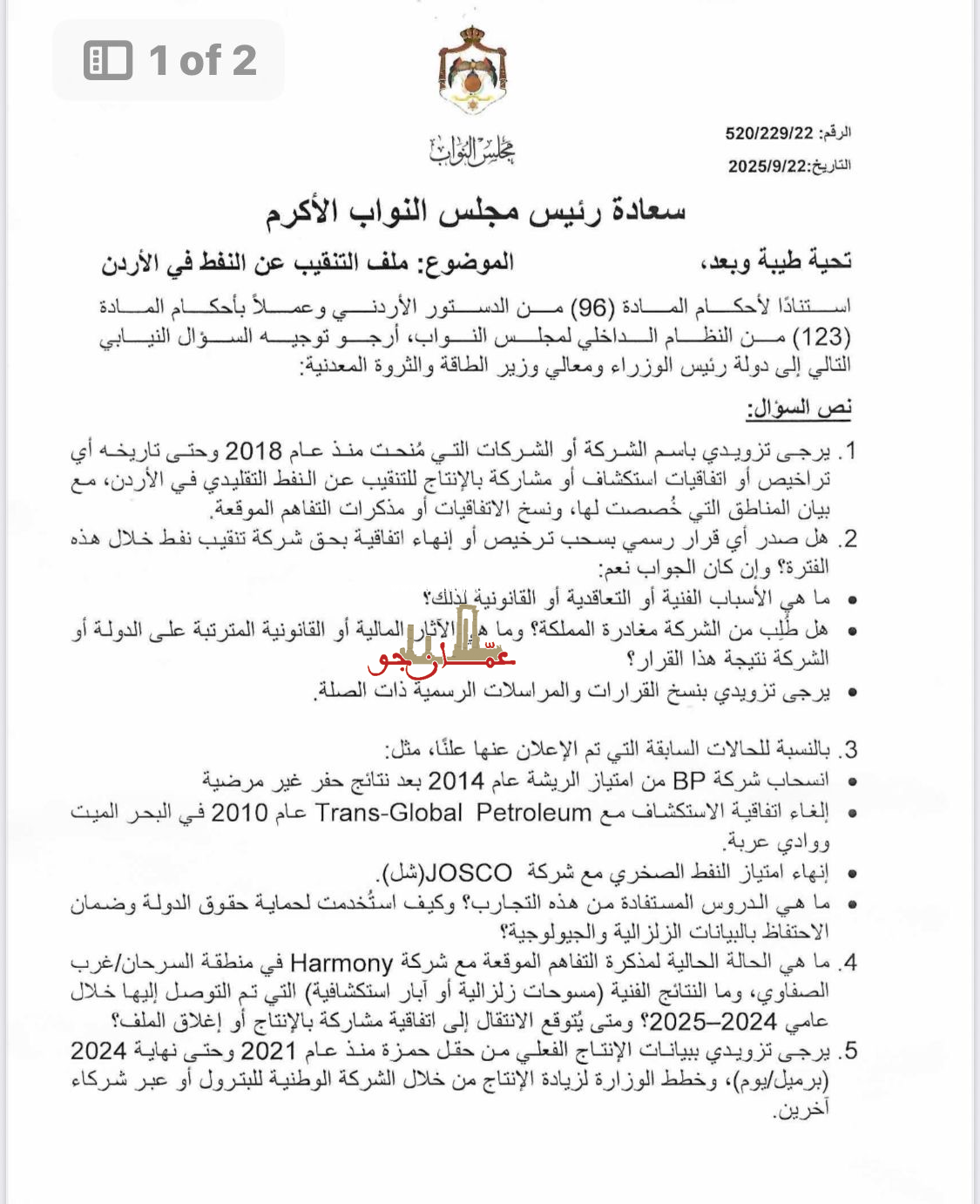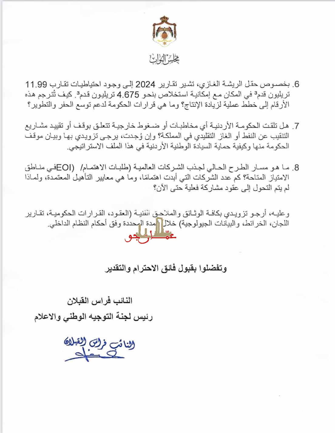 كما تساءل عن سر انسحاب الشركات العالمية مثل BP وTrans-Global Petroleum، وفشل تجارب JOSCO وHarmony، مؤكدًا أن المواطن الأردني من حقه أن يعرف: هل نحن أمام ضغوط خارجية تُعيق استغلال ثرواتنا؟ أم أن الخلل في إدارة الملف داخلي؟