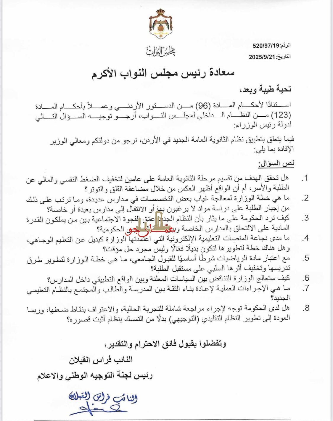 وفي ملف التعليم، اتهم القبلان الحكومة بأنها لم تحقق أهدافها من نظام الثانوية العامة الجديد، بل زادت معاناة الطلبة وأهاليهم. وقال: بدلًا من تخفيف الضغط النفسي والمالي، أثبت النظام الجديد أنه عبء إضافي، وأربك العملية التعليمية، وفتح الباب أمام تضارب السياسات بين المعلن والواقع.