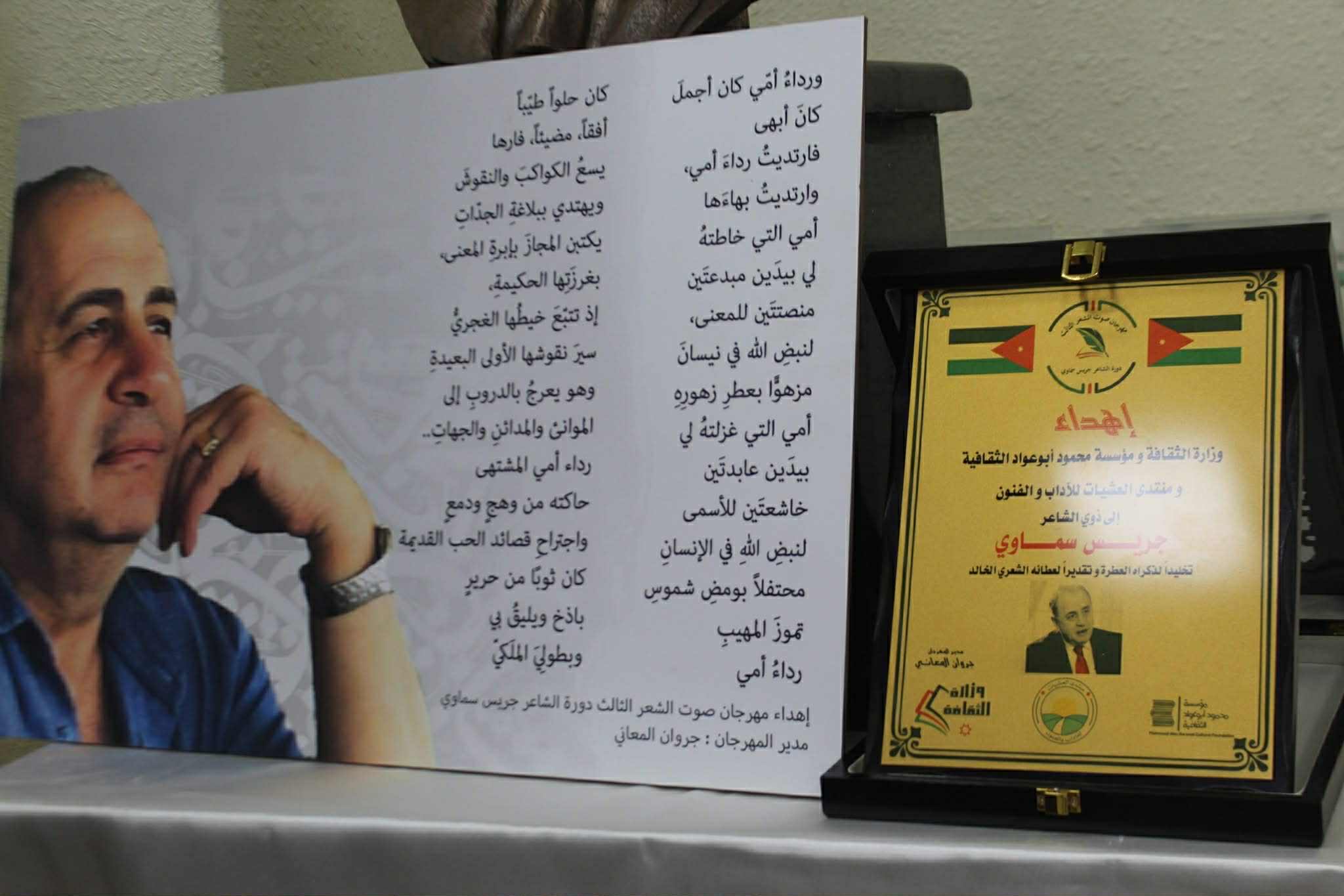 واستهلت فعاليات المهرجان الذي أداره الدكتور علي الشوابكة بالسلام الملكي وفيلم توثيقي عن المرحوم جريس سماوي شخصية المهرجان من اعداد واخراج المخرج محمد الشوابكة تحدث عن سيرة الشاعر جريس سماوي . راعي المهرجان الدكتور نضال العياصرة في كلمة له قصيرة مباركا بافتتاح المهرجان واختيار شخصية ثقافية أردنية كان لها دور كبير في الحركة الثقافية الأردنية . من جانبه تحدث مدير مدير المهرجان جروان المعاني في كلمة شكر فيها كل من ساهم في دعم المهرجان خاصة وزارة الثقافة ومؤسسة محمود ابو عواد الثقافية والأديبة سلامة عبدالحق .