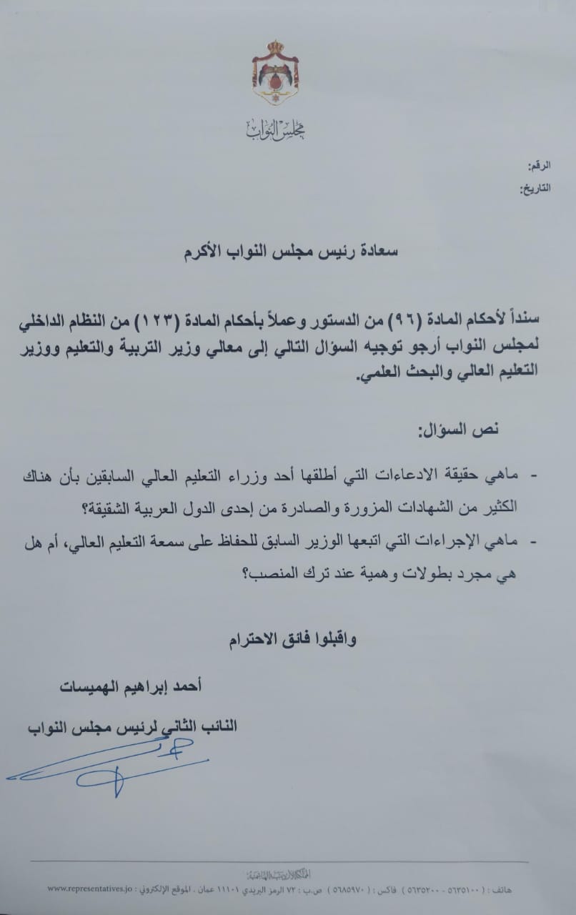 وتناول الهميسات في سؤاله النيابي حقيقة الادعاءات التي أطلقها أحد وزراء التعليم العالي السابقين، والتي تحدث فيها عن وجود عدد كبير من الشهادات المزورة والصادرة من إحدى الدول العربية الشقيقة.