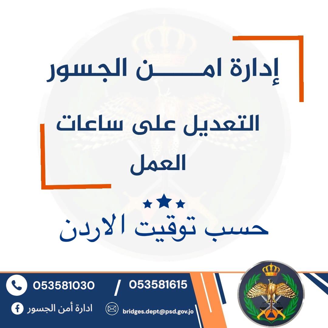 أعلنت إدارة أمن الجسور في مديرية الأمن العام، عن تعديل ساعات العمل الرسمي لجسر الملك حسين اعتباراً من يوم الأحد الموافق 26 تشرين الأول الحالي، وذلك على النحو التالي: