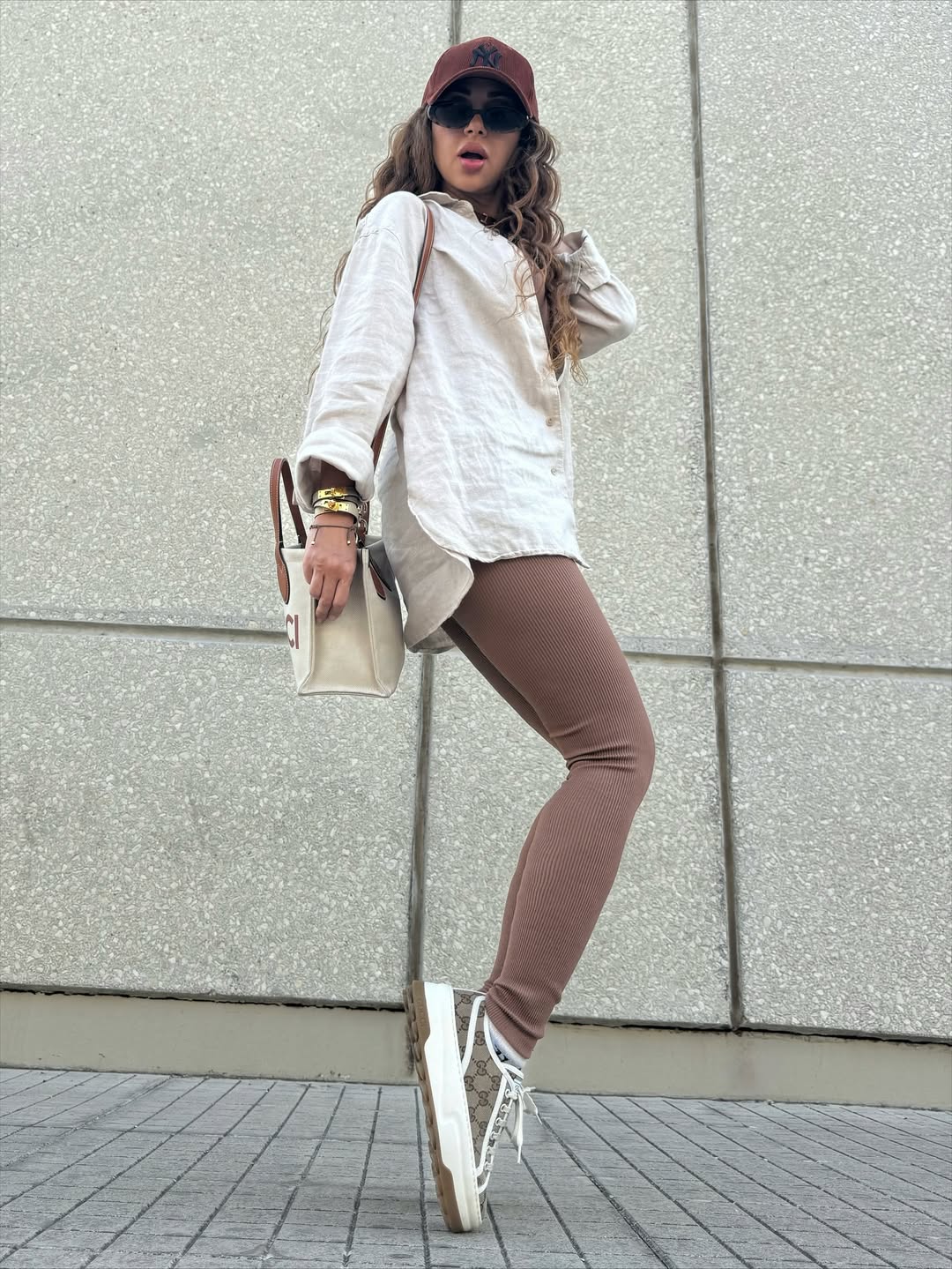 وأطلّت الفنانة اللبنانية في الصور وهي تقف على أطراف أصابع قدميها بحذاء رياضي خفيف، نسّقته مع ملابس شتوية مريحة عبارة عن "ليغنغ" باللون البنّي، وتوب بنّية وقميص أبيض فضفاض، وحملت على كتفها حقيبة بيضاء متوسطة الحجم وبتصميم كلاسيكي من "غوتشي" (Gucci).