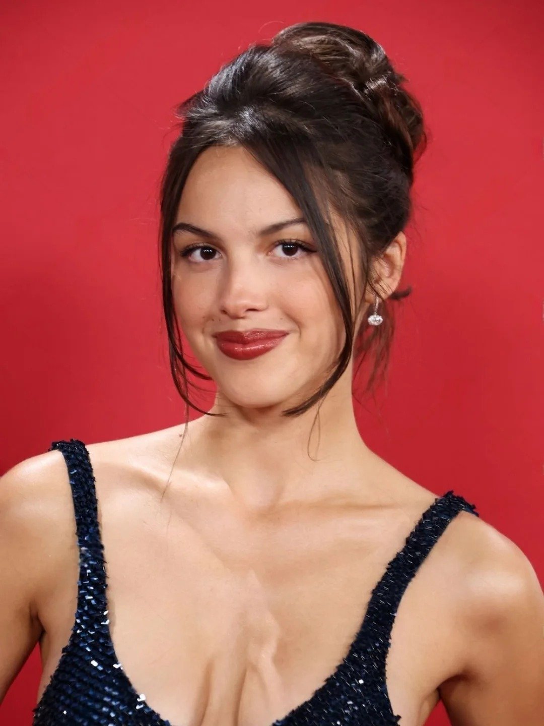 على الرغم من ارتفاع سعرها، إلا أن أقراط رودريغو كانت بسيطةً بشكلٍ مفاجئ. في الوقت نفسه، تألقت بفستانها على السجادة الحمراء، بآلاف الترتر الصغير المُخيط وفتحة عنقٍ عميقةٍ على شكل حرف U.