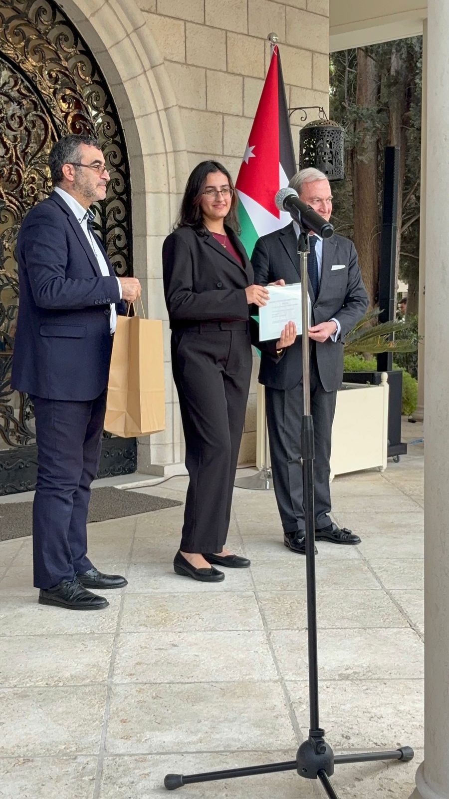 عمان جو_كرم السفير الفرنسي في عمان فرانك جيليه الطالبة لمار اسامه الراميني يوم الاثنين الموافق 17/11/2025 للمرة الثانية على التوالي تقديراً لتميزها ونجاحها الباهر وتفوقها في امتحان اللغة الفرنسية .