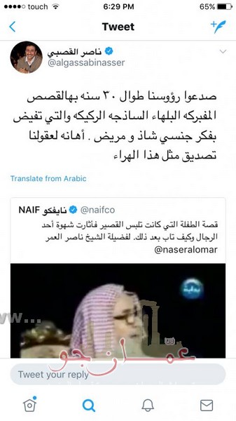 المعارك الاعلامية بين الفنان السعودي ناصر القصبي ورجال الدين تتواصل فصولاً، وجديدها في هذا المجال انتقاده في حسابه عبر "تويتر"، عضو الهيئة العليا لرابطة علماء المسلمين، المشرف العام على مؤسسة "ديوان المسلم"، الشيخ ناصر العمر، الذي كان برّر بسياق غير مباشر قصة شاب حاول اغتصاب طفلة بذريعة أنّها "ترتدي اللباس القصير فأثارت شهوته".