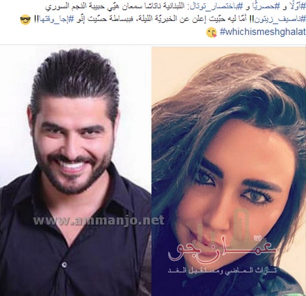 كشف الاعلامي إيلي باسيل عن هوية حبيبة النجم السوري ناصيف زيتون معلناً أنها اللبنانية ناتاشا سمعان ونشر باسيل عبر حسابه الخاص على "فايسبوك" صورة لناتاشا أرفقها بتعليق: "أوّلًا وحصريًّا وباختصار توتال: اللبنانية ناتاشا سمعان هيّي حبيبة النجم السوري ناصيف زيتون! أمّا ليه حبّيت إعلن عن الخبريّة الليلة، فببساطة حسّيت إنّو إجا وقتها!".
