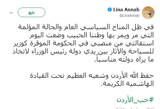 وقالت في تغريدة لها على حسابها الرسمي على تويتر إنه :" وفي ظل المناخ السياسي العام والحالة المؤلمة التي مر ويمر بها وطننا الحبيب وضعت اليوم استقالتي من منصبي في الحكومة الموقرة كوزير للسياحة والآثار بين يدي دولة رئيس الوزراء لاتخاذ ما يراه دولته مناسباً. حفظ الله الأردن وشعبه العظيم تحت القيادة الهاشمية الكريمة".