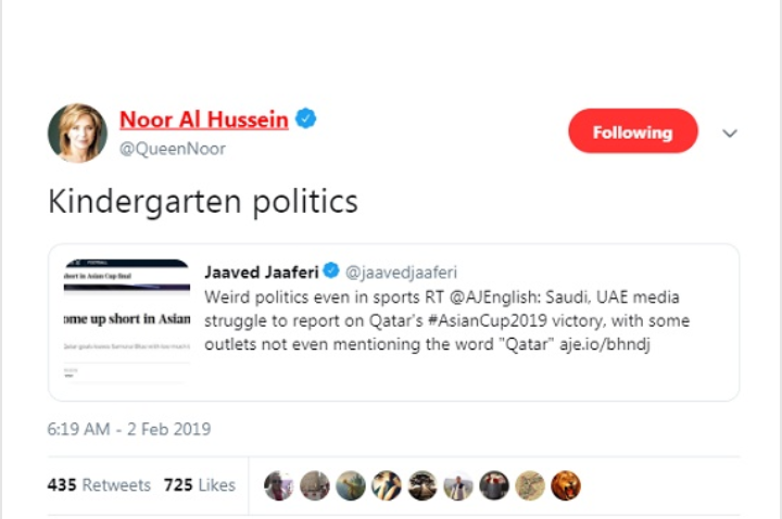 عمان جو - إعتبر مسؤول في الديوان الملكي الاردني، ان تعليق الملكة نور الحسين، أرملة العاهل الأردني الراحل، الحسين بن طلال، بشكل مقتضب ومثير على سياسات السعودية، والإمارات ووصفها بأنها:” سياسة طلاب الحضانة”، وذلك تعليقاً على تغريدة للمخرج والممثل الهندي جافيد جيفري، تتضمن عدم إشارة صحف وإعلام السعودية والامارات لدولة قطر بعد الفوز بكأس بطولة اسيا التي اقيمت مؤخراً في الامارات، لن يشكل ردة فعل قاسية من الدولتين الخليجيتين ضد الأردن.