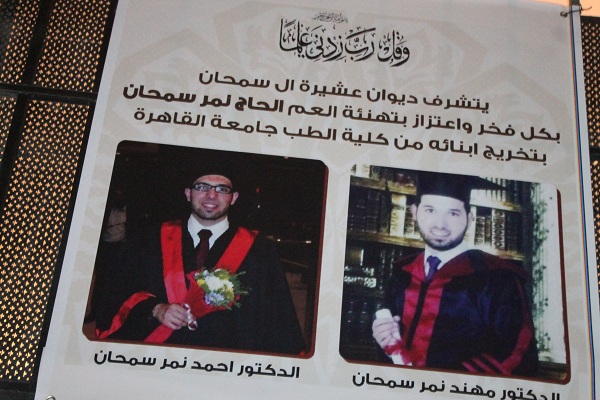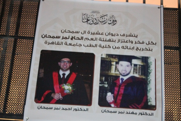 احتفلت ليلة الجمعة عشائر ال سمحان في الاردن بمناسبة تخرج ابنهم " الدكتور احمد نمر سمحان " و الدكتور " منهد نمر سمحان " من كلية الطب في جمهورية مصر العربية وحصوله على شهادة البكالوريس في الطب و الجراحة