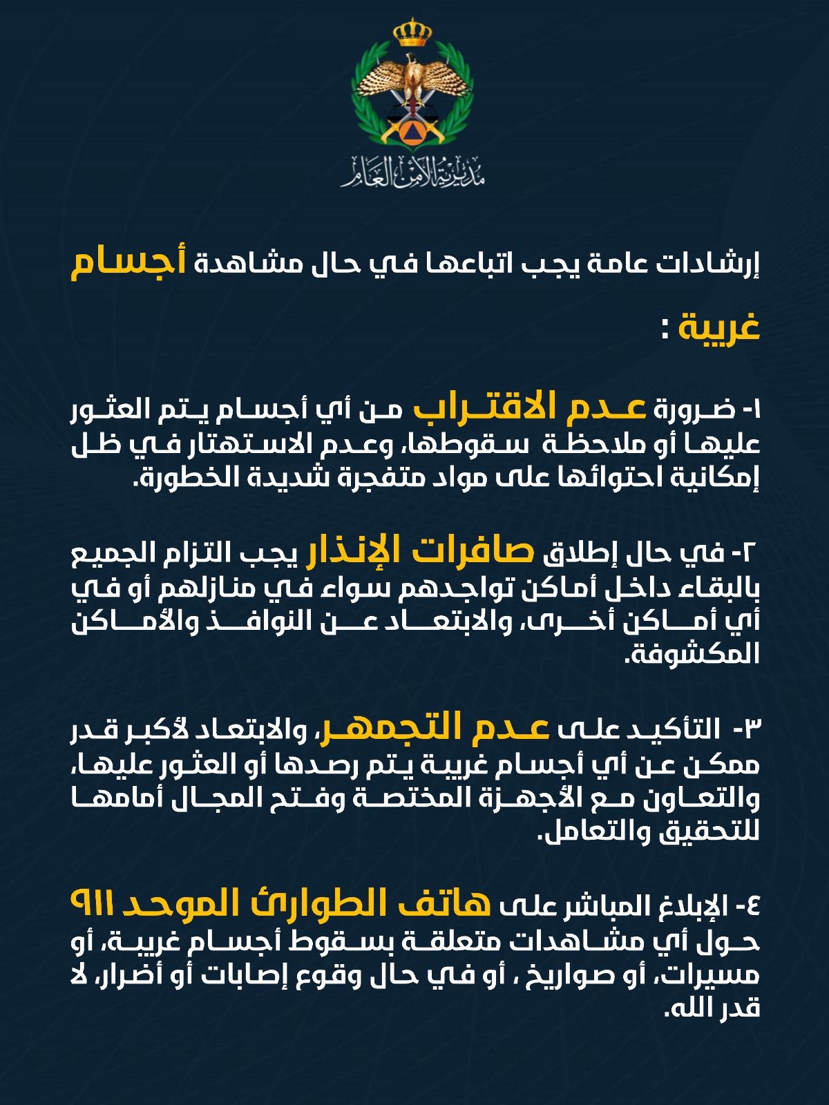 اخبار محلية - 14-06-2025 05:05 PMعمان جو- جددت مديرية الأمن العام تحذيرها بضرورة عدم الاقتراب من أي أجسام غريبة او من مناطق سقوطها والتي قد تكون خطيرة جداً.وأكدت على ضرورة عدم الاقتراب من هذه الأجسام أو...