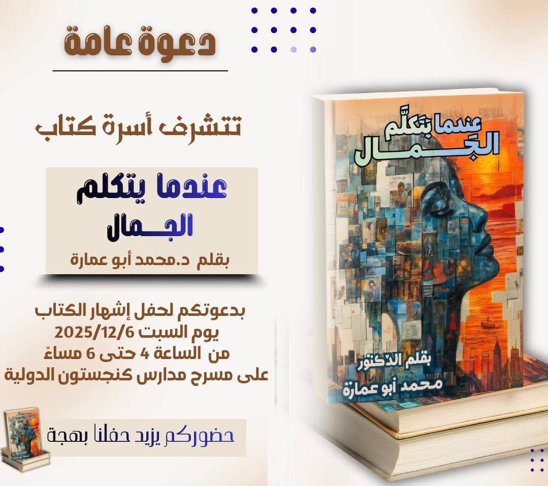 اخبار محلية - 01-12-2025 12:21 PMعمان جو_تستعد أسرة كتاب «عندما يتكلم الجمال» لإقامة حفل إشهار الإصدار الجديد للدكتور محمد أبو عمارة، وذلك يوم السبت الموافق 6 كانون الأول 2025، من الساعة 4 وحتى 6 مساءً على...