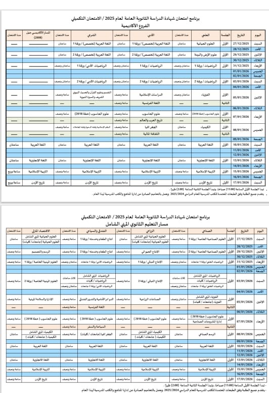 اخبار محلية - 03-11-2025 06:11 PMعمان جو - أعلنت وزارة التربية والتعليم، اليوم الاثنين، جدول امتحانات شهادة الدراسة الثانوية العامة التوجيهي للامتحان التكميلي لعام 2025.وبحسب بيان للوزارة يبدأ أول أيام...