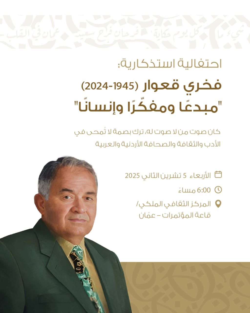 أخبار برلمانية - 29-10-2025 11:13 AMعمان جو_يحتفي أصدقاء ومحبو وعائلة الأديب والصحفي والبرلماني والنقابي الراحل فخري قعوار، الذي انتقل إلى رحمة الله تعالى في العام الماضي، بمسيرته وأفكاره وكتاباته في أمسية...