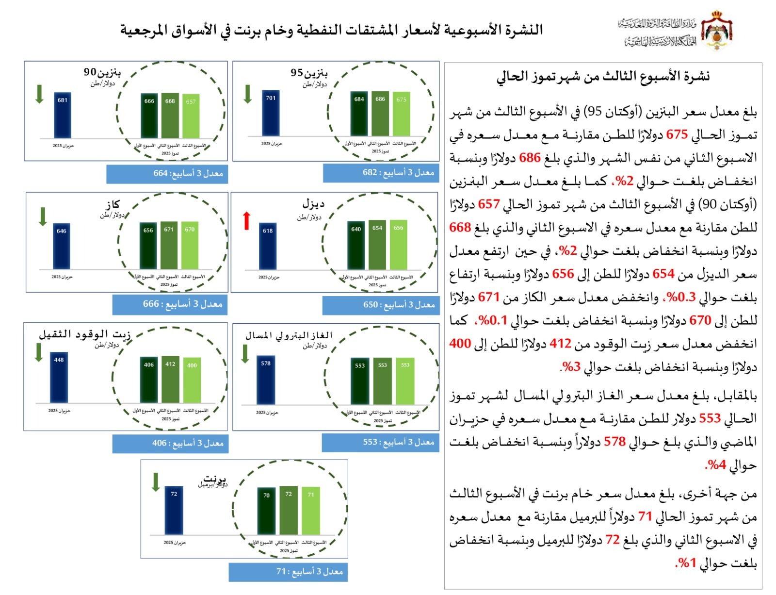 اخبار اقتصادية - 23-07-2025 01:08 PMعمان جو - انخفضت أسعار المشتقات النفطية في الأسواق العالمية خلال الأسبوع الثالث من تموز الحالي، مقارنة مع أسعارها في الأسبوع الثاني من ذات الشهر، بحسب النشرة الأسبوعية التي...