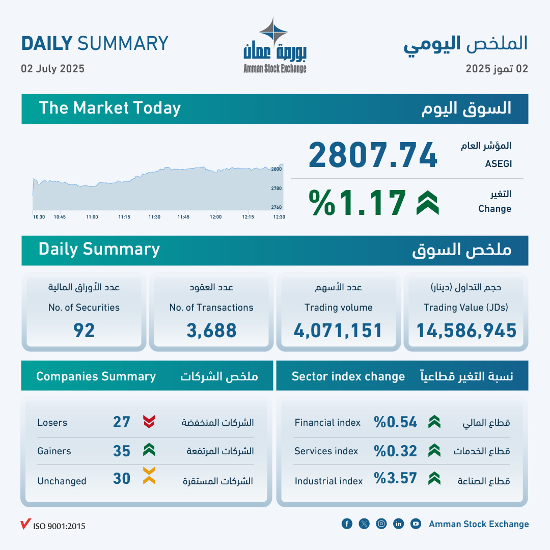 بورصة عمان تغلق تداولاتها على ارتفاع