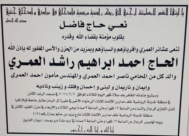 والد سليمان الدبابنه رئيس قسم التسويق في شركة التأمين العربية في ذمة الله