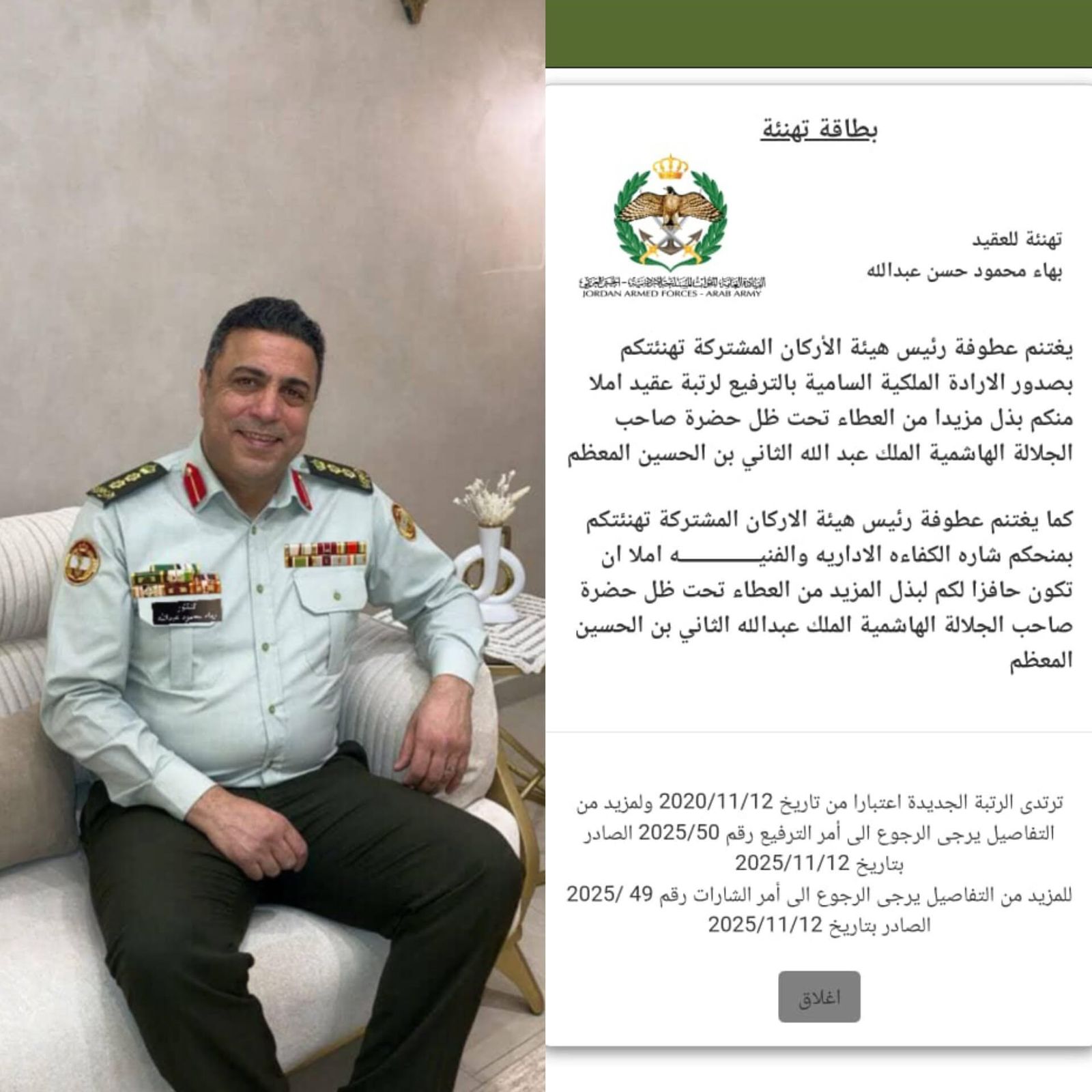 خبر و صورة - 13-11-2025 07:49 PMعمان جو - المهندس محمد احمد عبدالله يبارك لعمه العقيد الدكتور بهاء محمود عبدالله بمناسبة الترفيع الى رتبة عقيد ، وحصوله على وسام الكفاءة الإدارية والفنية ، متمنياً له...