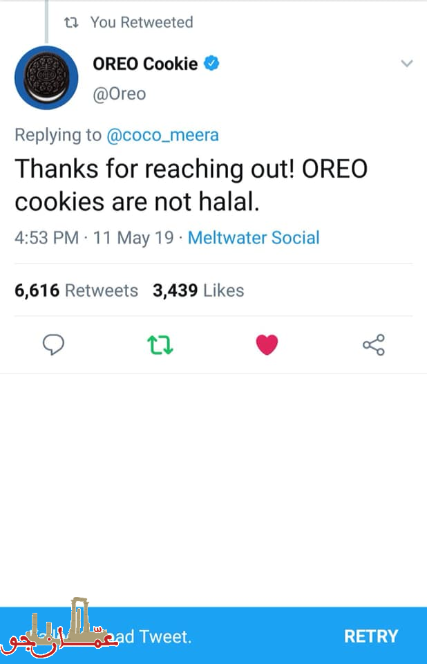"أوريو ليست حلالًا. شكرًا على رسالتك"، كما جاء في تغريدة منسوبة لشركة أوريو على تويتر يوم 11 مايو /أيار 2019.