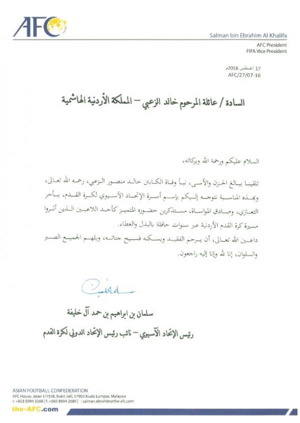 عمان جو - تسلمت أسرة فقيد الكرة الأردنية خالد الزعبي اليوم الأربعاء، برقية تعزية من الشيخ سلمان بن إبراهيم رئيس الاتحاد الآسيوي، نائب رئيس الاتحاد الدولي.