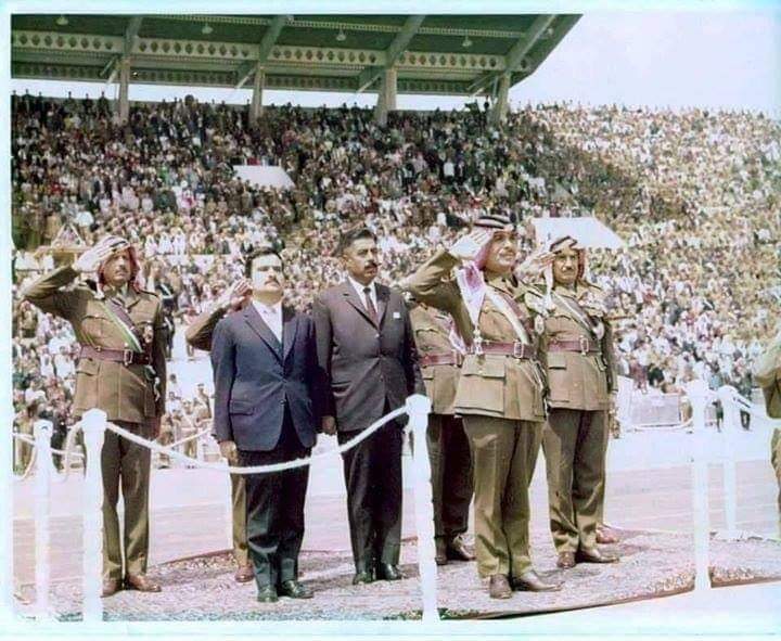 عمان جو - صورة تجمع جلالة الملك الحسين وبمعيته حابس باشا المجالي والشهيد وصفي التل وسمو الأمير الحسن والأمير المشير زيد بن شاكر في احدى المناسبات الوطنية التي احتضنها ستاد عمان الدولي في مطلع السبعينيات.