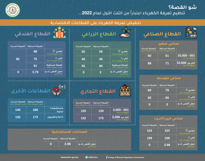 وحول تفاصيل التعرفة الكهربائية للقطاعات، بيّن اللبون أن التعرفة الكهربائية ستنخفض على القطاع التجاري بموجب التعرفة الجديدة لمن يستهلك أكثر من 2000 كيلو واط شهرياً من 175 فلسا ك. و. س إلى 152 فلساً. أما فيما يتعلق بالتعرفة للاستهلاك من 1 الى 2000 كيلو واط ساعة، تبقى كما هي 120 فلساً.