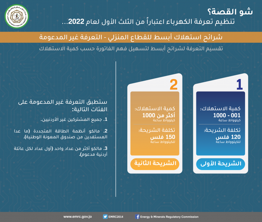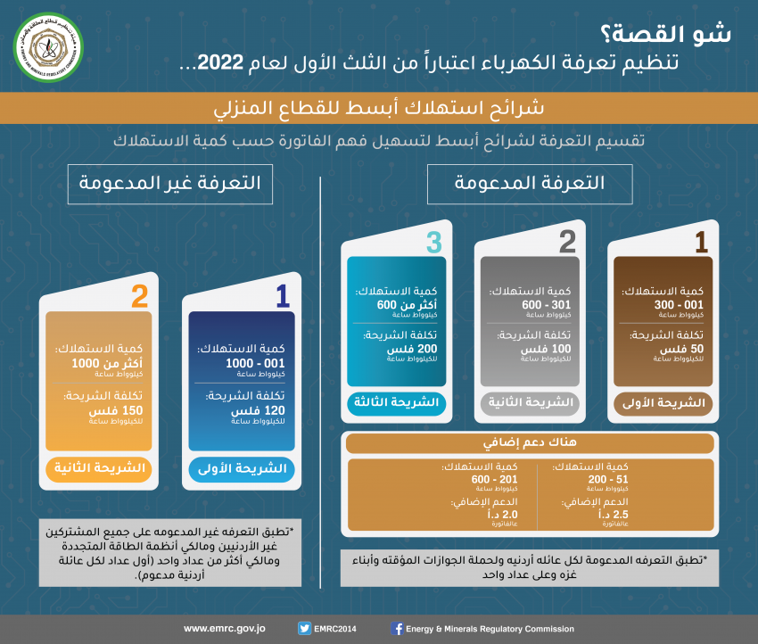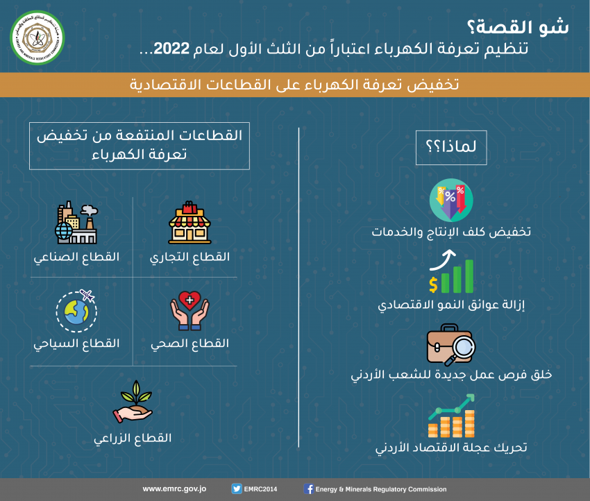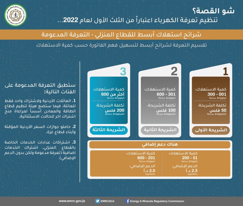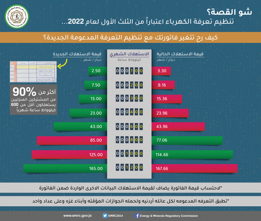 وتأتي هذه الإجراءات ضمن خطة لتنظيم التعرفة الكهربائية خلال الثلث الأول من عام 2022، من خلال توجيه دعم التعرفة الكهربائية للمشتركين الأردنيين وإزالة التشوّهات في التعرفة الحالية وزيادة الشفافية وتبسيط الفواتير لتسهيل فهمها من قبل المشتركين، في حين تشمل الخطة أيضاً تنفيذ مطالب القطاعات الاقتصادية الحيوية بتخفيض كلف الطاقة الكهربائية لزيادة تنافسيتها وتحفيز قدرتها على تحقيق النمو المستدام.