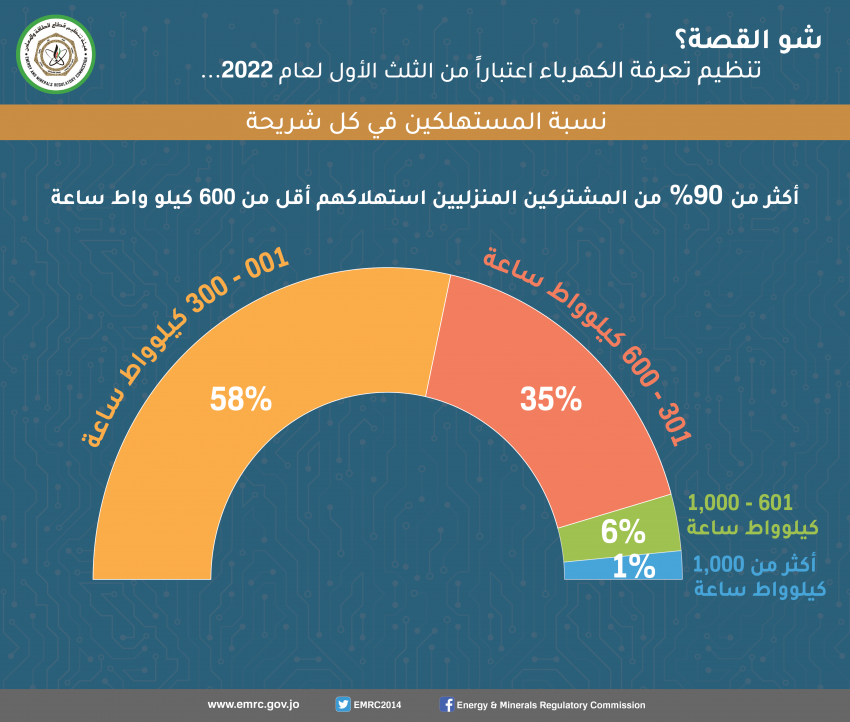 وأعاد التأكيد على أن قيمة الفاتورة لن ترتفع على كل من يستهلك 600 كيلو واط للساعة أو أقل (أي قيمة فواتيرهم ٥٠ دينارا فما دون) بل ستنخفض انخفاضاً طفيفاً، مع استمرار تقديم الدعم على الفاتورة بالألية المعمول بها حالياً، مبينا أن نسبة المشتركين المنزليين التي تستهلك أقل من (600) كيلو واط للساعة تشكّل حوالي 90% من إجمالي عدد المستهلكين في القطاع المنزلي.