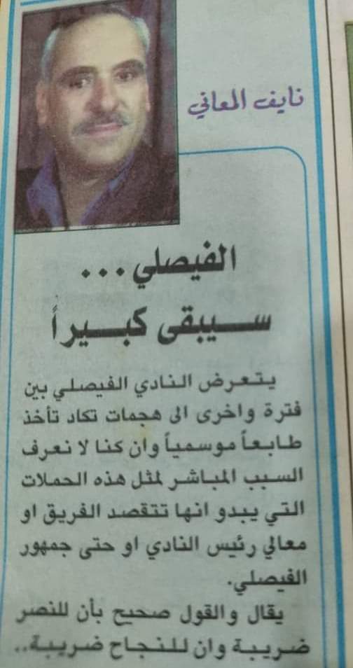 المرحوم المعاني كان قد كتب مقاله في صحيفة النادي الفيصلي التي كان يترأس تحريرها وحذر من المؤامرات التي تحاك ضد هذا الكيان الوطني وفي ادناه زنكو غرافية لبيت القصيد في مقاله الذي ينطبق على ما يلاقيه الفيصلي من مؤامرات هذه الأيام..!.