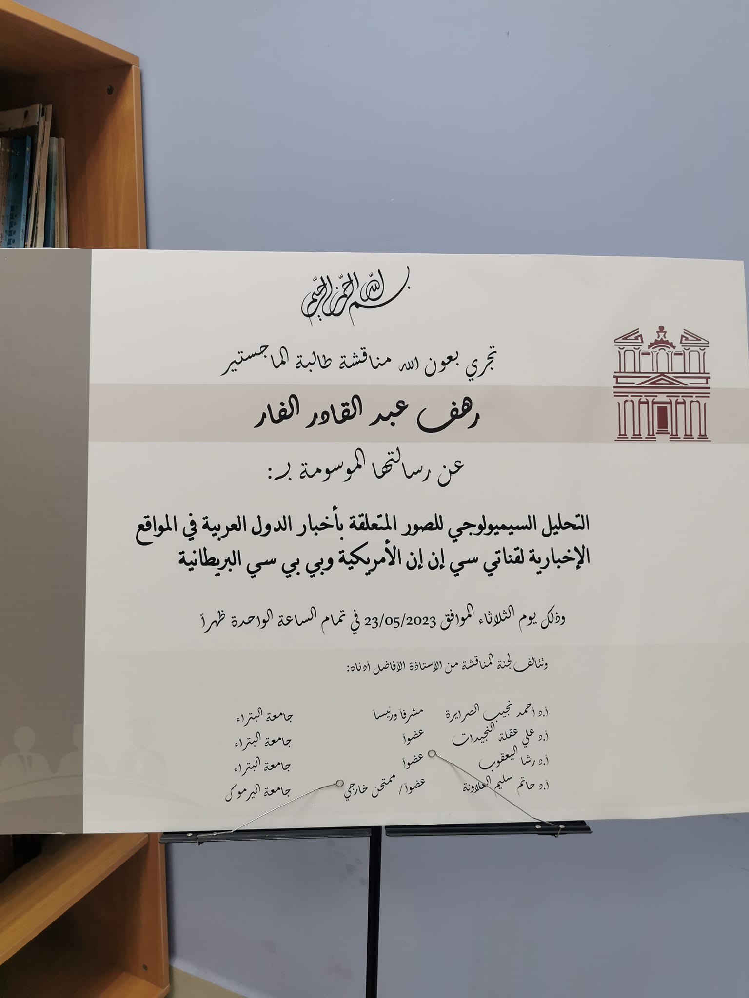 عمان جو - نوقشت في جامـعـة البترا رسـالـة ماجـستيـر بعنوان التحليل السيميولوجي للصور المتعلقة بأخبار الدول العربية