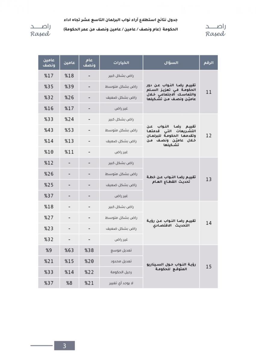 وعند سؤال النواب عن رأيهم بالسيناريو الأقرب للحكومة خلال الفترة المقبلة تبين أن 67٪ من النواب يرون أن الحكومة باقية حيث يرى 9٪ منهم أنه سيتم إجراء تعديل موسّع، بينما يرى 21٪ منهم أنه سيتم إجراء تعديل محدود، و37٪ منهم لا يرون أي تعديل أو تغيير على الحكومة، ويرى 33٪ من النواب أن الحكومة غير باقية.