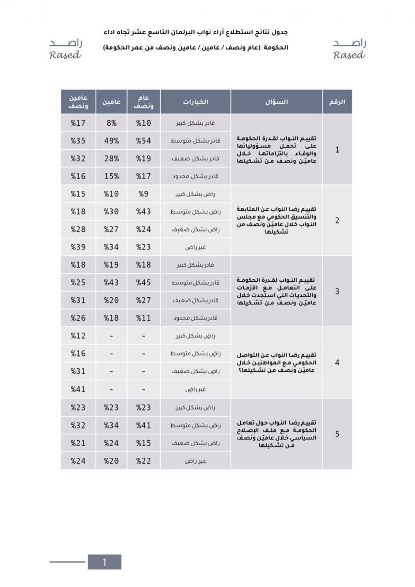 عمان جو - بينت نتائج تقرير مركز راصد لمراقبة التفاعل الحكومي النيابي نتائج استطلاع أراء النواب حول أداء حكومة الخصاونة خلال عامين ونصف من تشكيلها، حيث استجاب 115 برلمانية وبرلمانياً وامتنع عن الإجابة 5 برلمانيين، ولم يتمكن فريق البحث من الوصول الى 10 نواب.