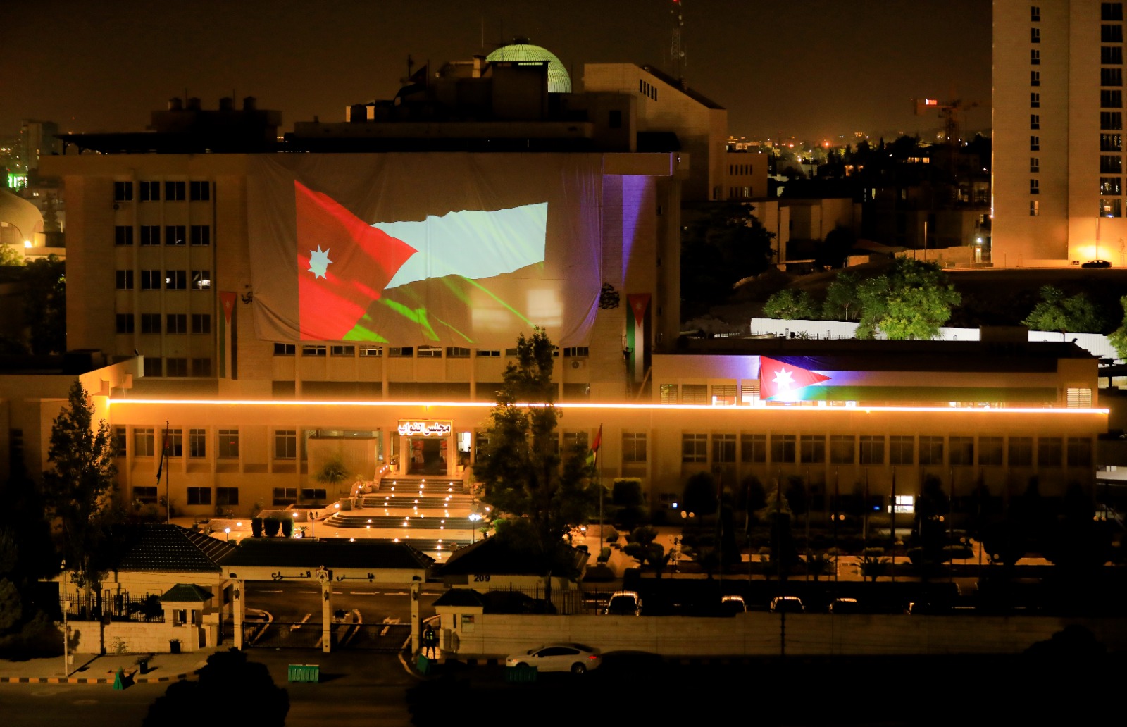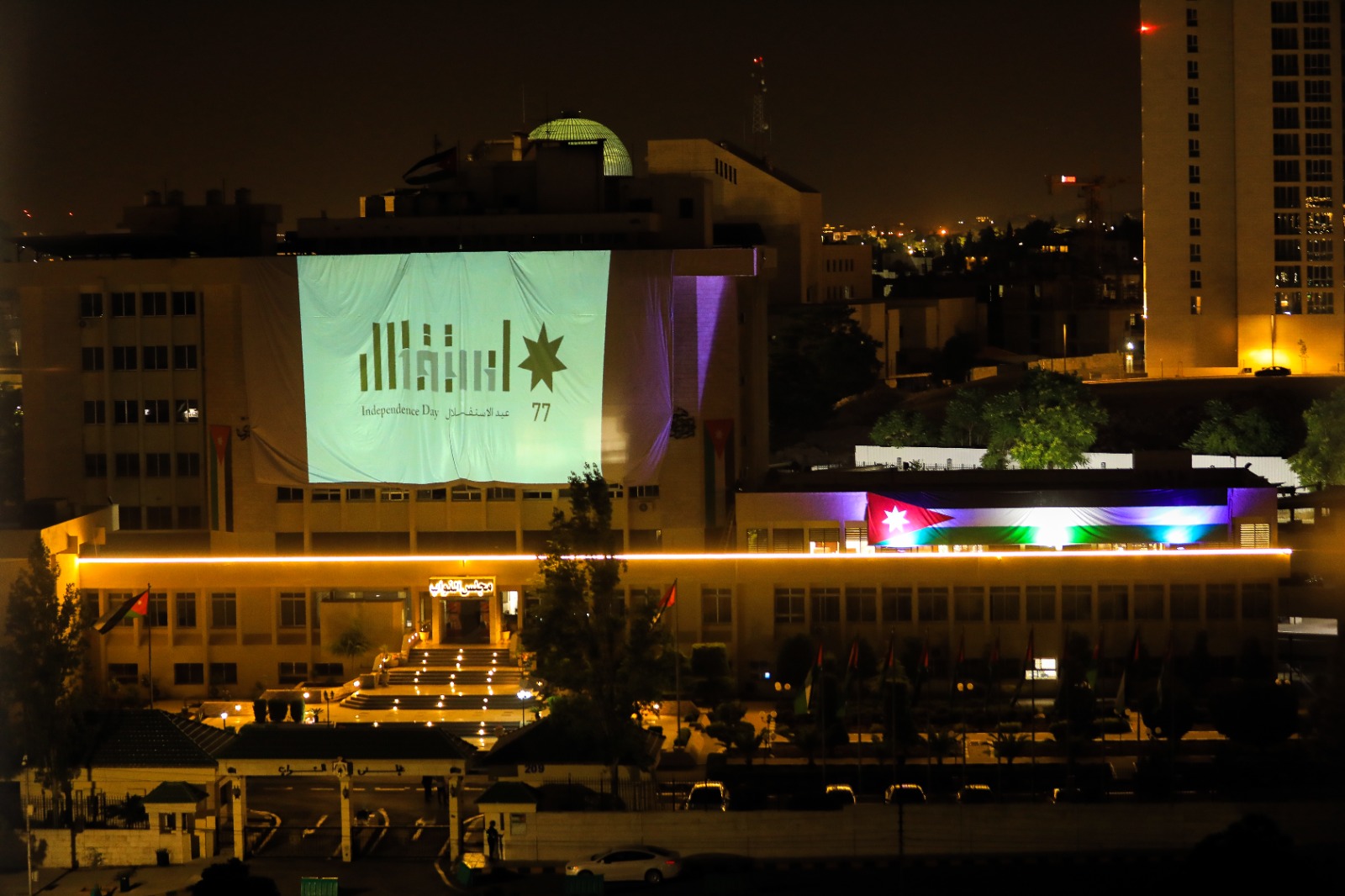وأضاء مبنى المجلس بعناوين الثورة العربية الكبرى منذ نشأة الدولة الأردنية في محاكاة حول الفرحة الوطنية بالاستقلال والالتفاف خلف القيادة الهاشمية الحكيمة.