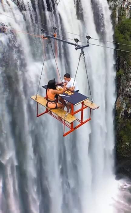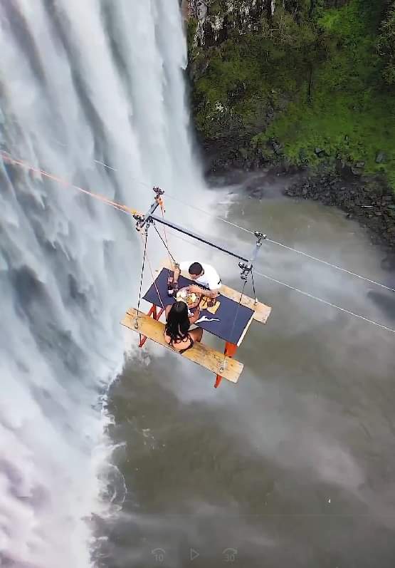 وشارك الحبيبان مقطع فيديو لهما وهما يتناولان وجبة طعام على طاولة معلقة على ارتفاع 295 قدمًا (90 مترًا) فوق شلال في البرازيل.