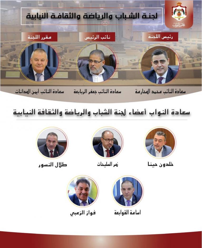 وفيما يتعلق بلجنة الشباب والرياضة والثقافة فقد فاز برئاستها بالتزكية النائب محمد المحارمة والنائب جعفر ربابعة نائبا للرئيس والنائب ايمن مدانات مقررا.