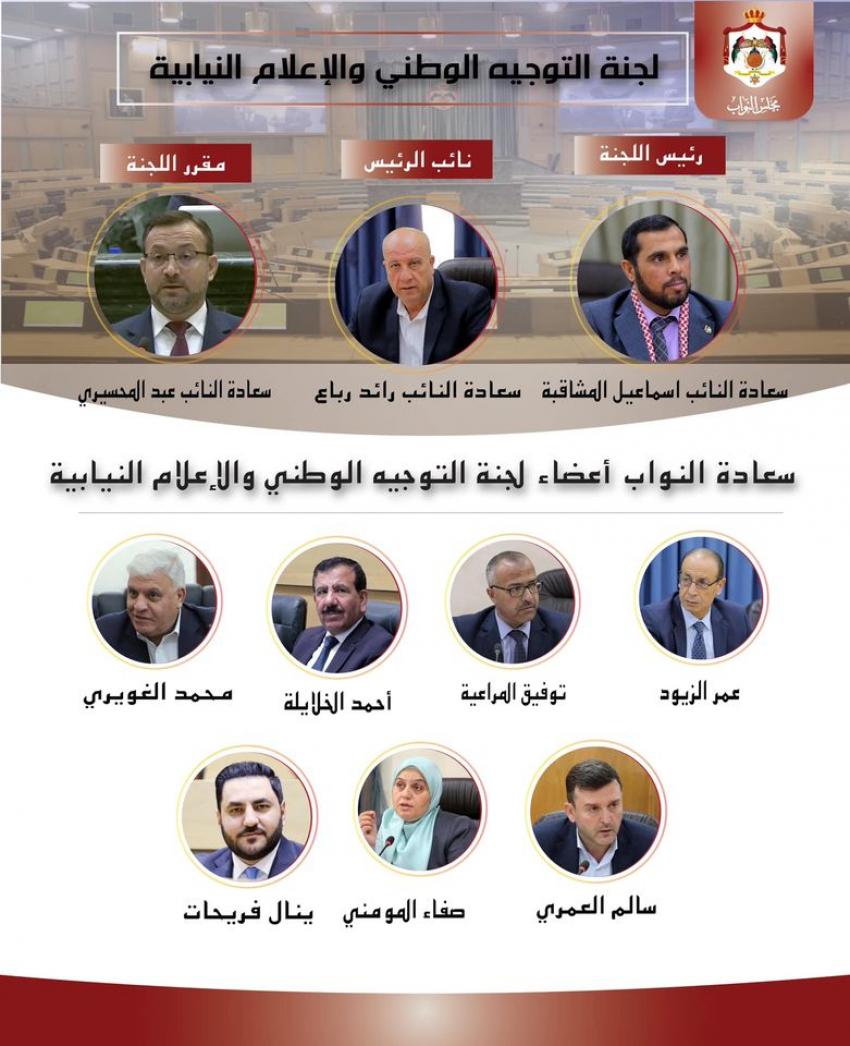 وفاز بالانتخاب النائب الدكتور اسماعيل المشاقبة برئاسة لجنة التوجيه الوطني والإعلام فيما فاز بالتزكية النائب رائد رباع نائبا للرئيس والنائب عبد المحسيري مقررًا.