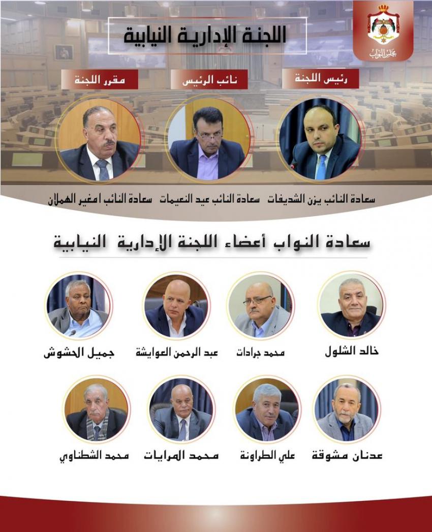 اما بالنسبة للجنة الادارية فاز برئاستها بالانتخاب النائب يزن الشديفات وفاز بالتزكية النائب عيد النعيمات نائبًا للرئيس والنائب مغير الهملان مقررًا.