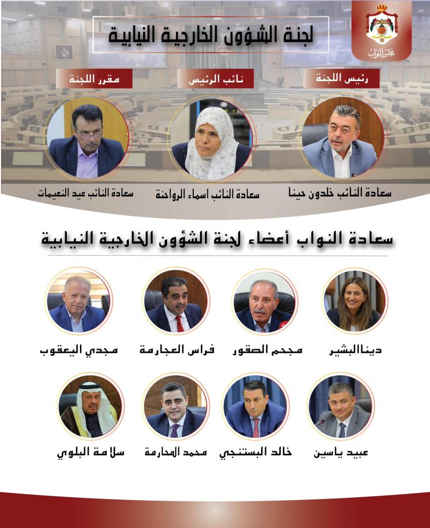 فيما فاز برئاسة لجنة الشؤون الخارجية بالتزكية النائب خلدون حينا والنائب اسماء الرواحنة نائبًا للرئيس والنائب عيد النعيمات مقررًا.