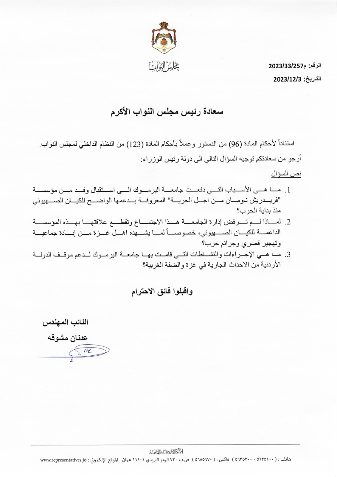 عمان جو - وجه النائب عدنان مشوقة، سؤالا إلى الحكومة يستوضح من خلاله عن الأسباب التي دفعت جامعة اليرموك الى استقبال وفد من مؤسسة “فريدريش ناومان من اجل الحرية” المعروفة بدعمها الواضح للكيان الصهيوني منذ بداية الحرب.