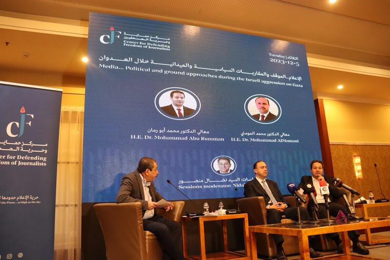 وفي الجلسة الأخيرة التي تحدث بها ناصر أبو بكر نقيب الصحفيين الفلسطينيين عبر كلمة مصورة، ووائل الدحدوح مدير مكتب الجزيرة في غزة عبر اتصال هاتفي، والدكتورة نهلة المومني من المركز الوطني لحقوق الإنسان، قال أبو بكر إن أكثر من 1200 صحفي وصحفية يعيشون دون مأوى في قطاع غزة، ويعملون تحت القصف، ونزحوا أكثر من مرة خلال العدوان، مضيفا أن هناك مشكلة كبيرة في توفير معدات السلامة المهنية.
