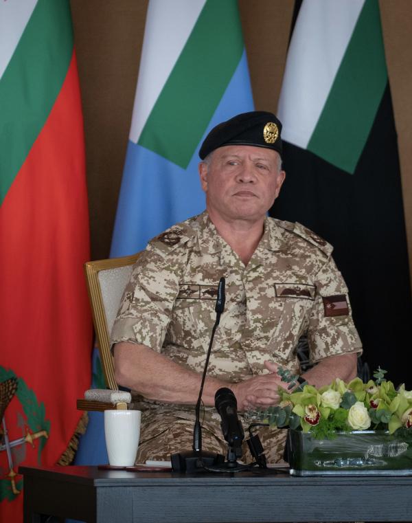 وقال رئيس هيئة الأركان المشتركة اللواء الركن يوسف أحمد الحنيطي: نرحب بكم سيدي أجمل ترحيب بين جندكم الأوفياء ورفاق السلاح، الذين عاهدوا الله أن يبقوا مثلا للأمانة والوفاء والإخلاص في خدمة الوطن وقائده والذود عن الحمى بالمهج والأرواح.