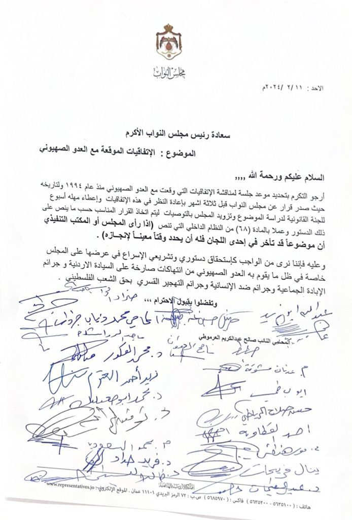 وتبنى النائب العرموطي مذكرة وقع عليها عدد نواب، مؤكدا على واجب الإسراع في عرض الاتفاقيات على المجلس في ظل ما يقوم به الاحتلال من جرائم إبادة جماعية في غزة.