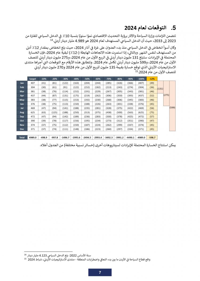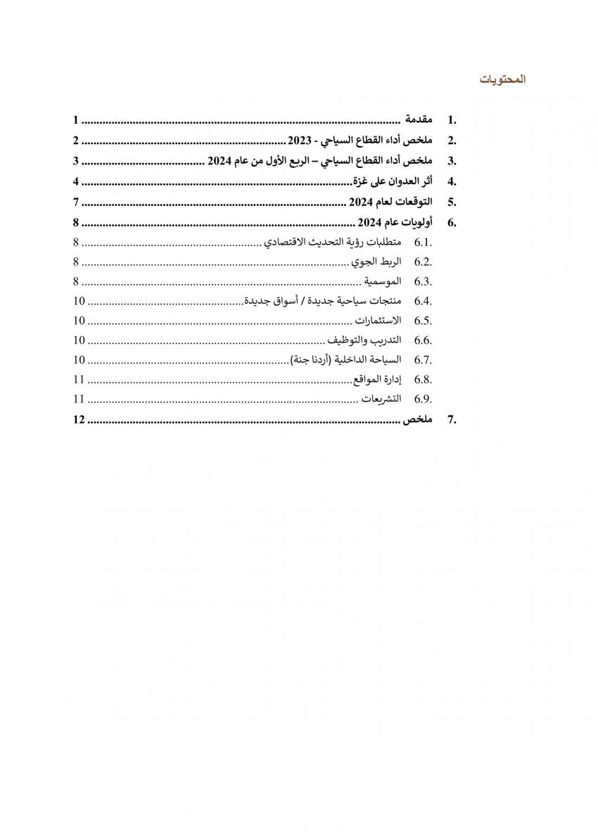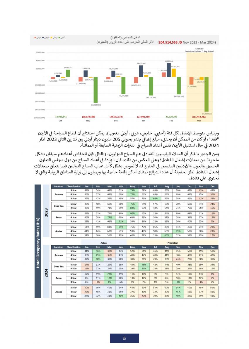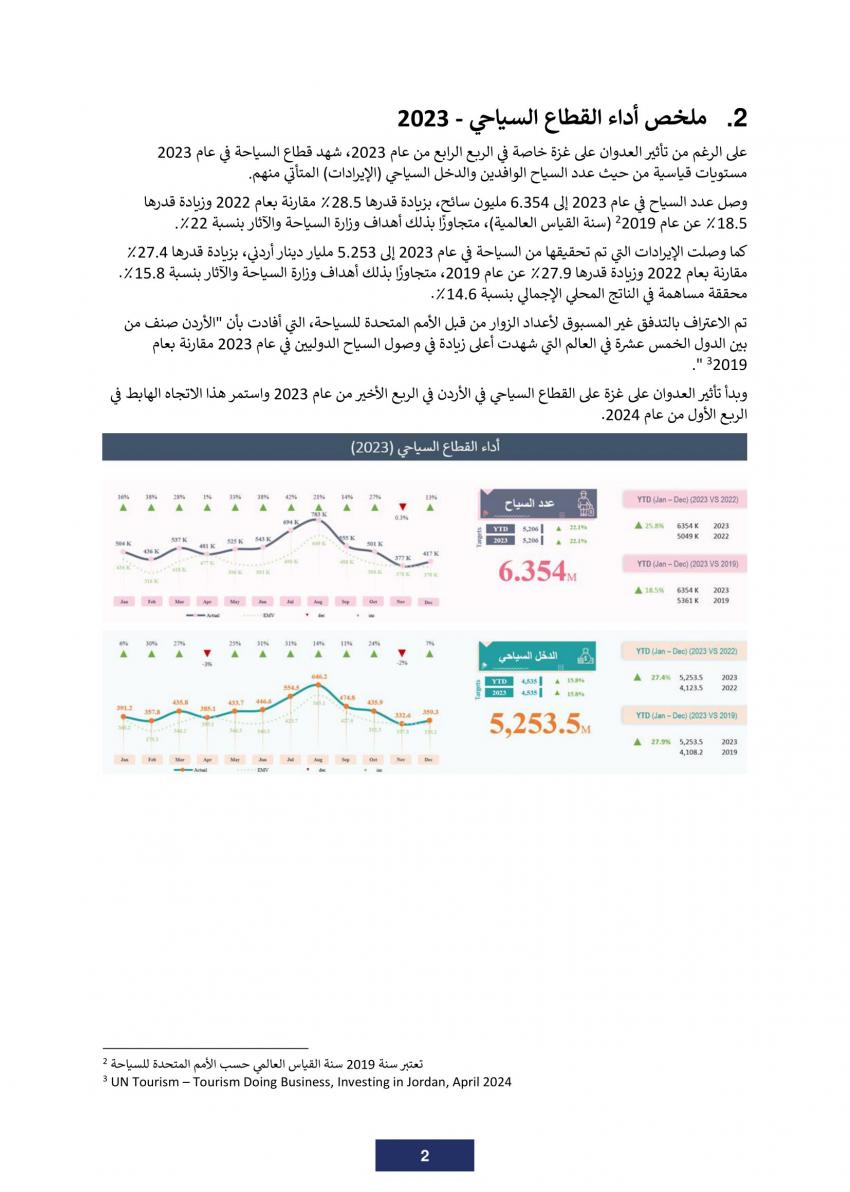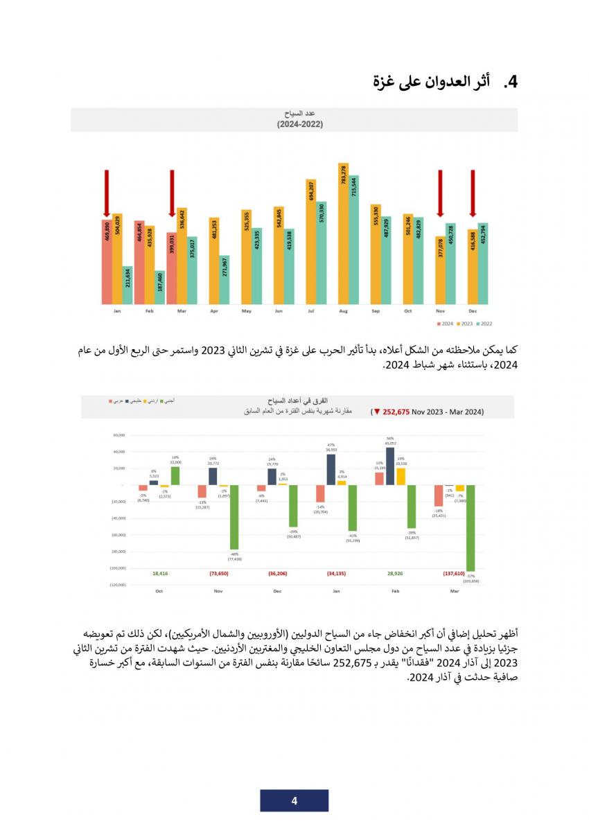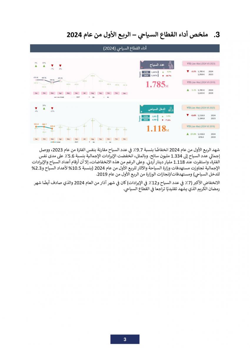 وأظهر التقرير انخفاضا بنسبة 9.7 بالمئة في عدد السياح، مقارنة بنفس الفترة من العام 2023، حيث وصل عدد السياح إلى 1.334 مليون سائح، كما انخفضت إيرادات القطاع بنسبة 5.6 بالمئة على مدى نفس الفترة لتسجل 1.118 مليار دينار وذلك بسبب الأحداث الإقليمية في المنطقة.