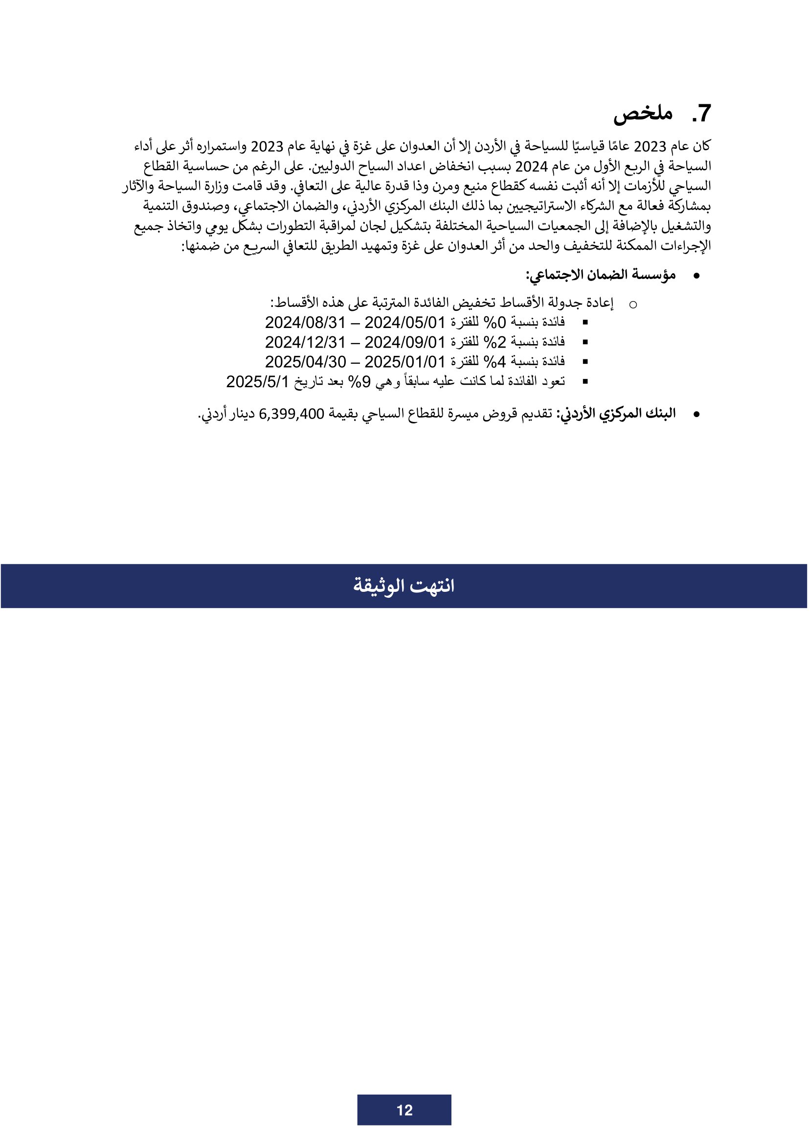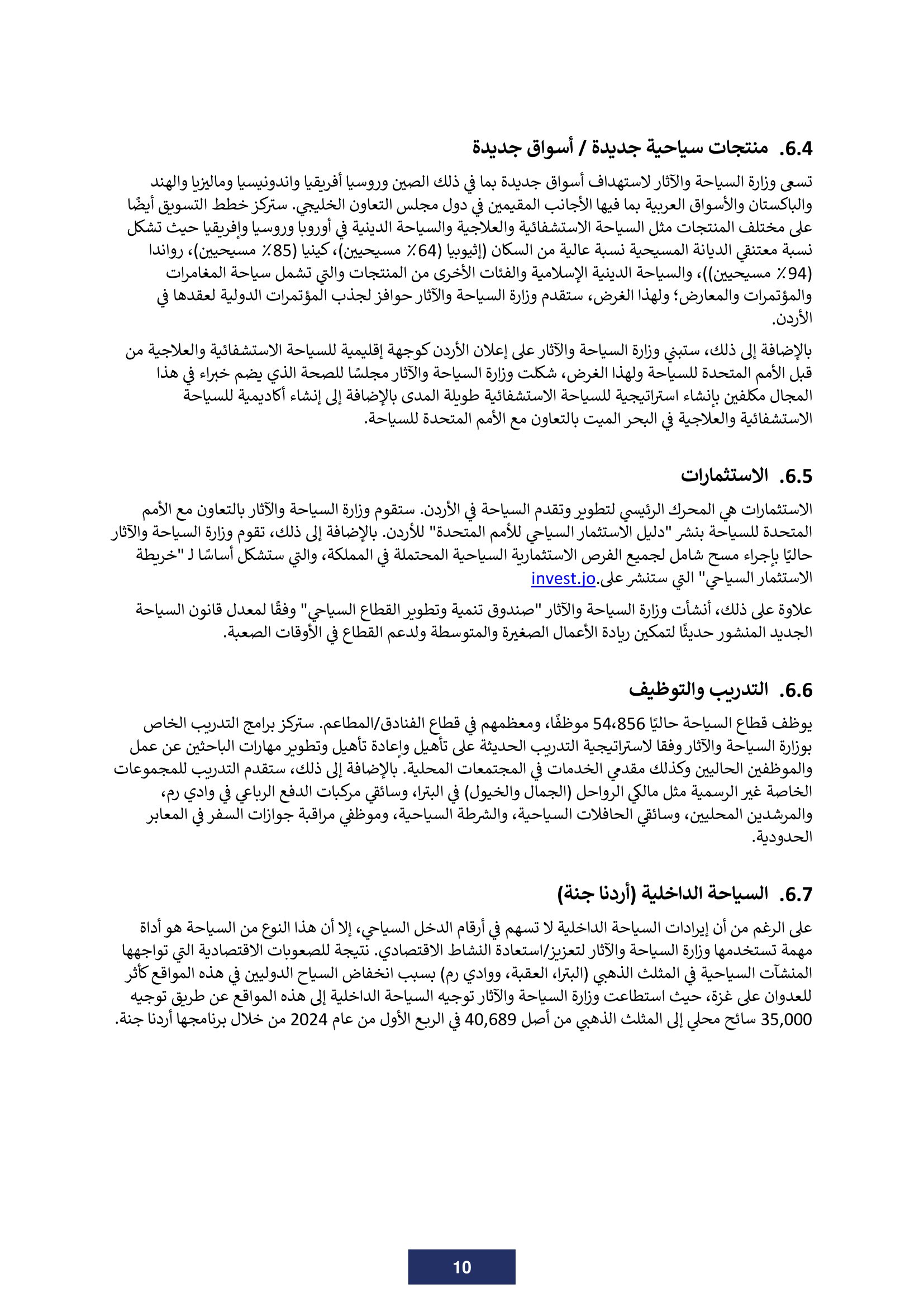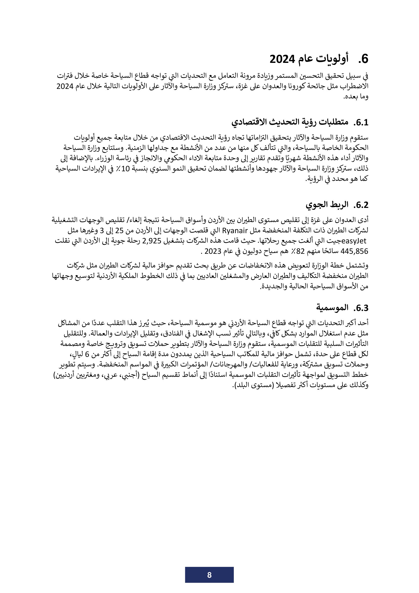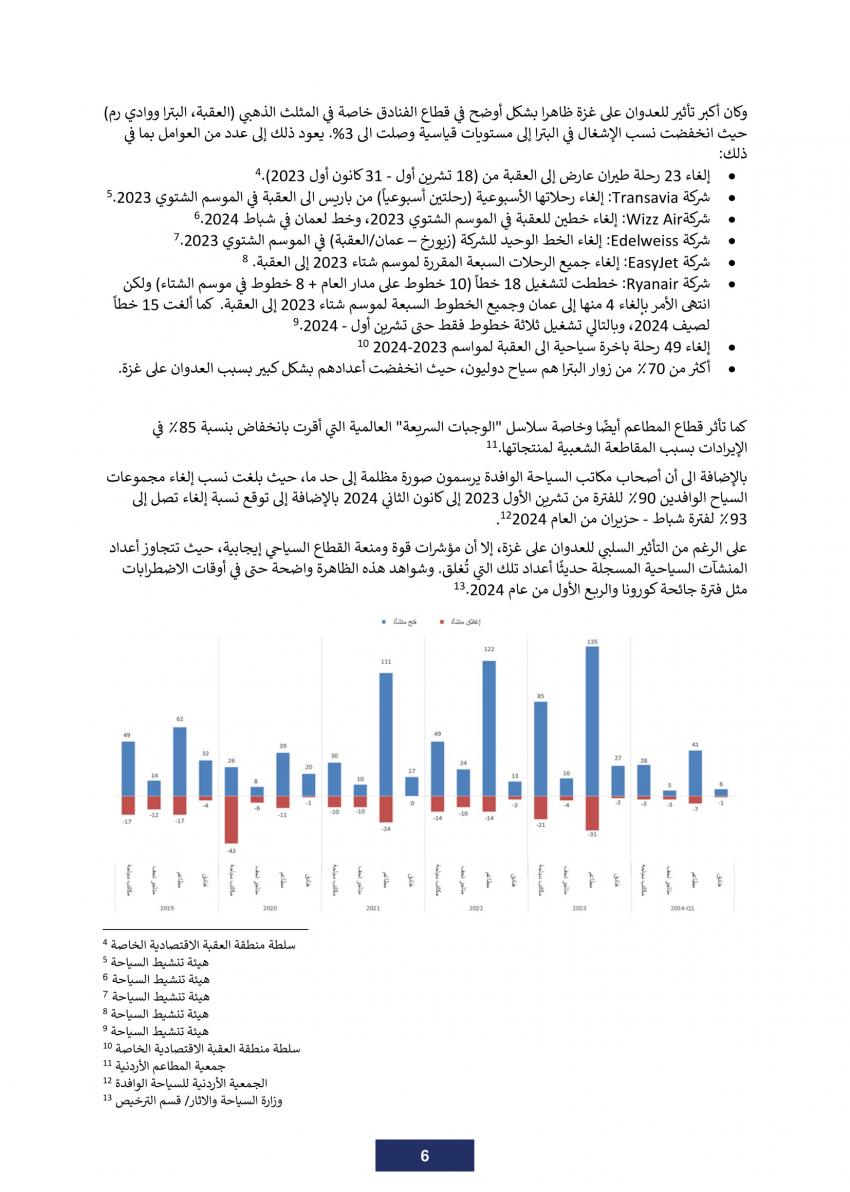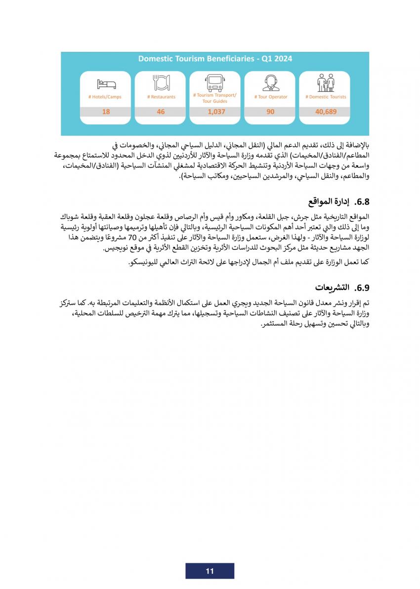وأظهر التقرير انخفاضا بنسبة 9.7 بالمئة في عدد السياح، مقارنة بنفس الفترة من العام 2023، حيث وصل عدد السياح إلى 1.334 مليون سائح، كما انخفضت إيرادات القطاع بنسبة 5.6 بالمئة على مدى نفس الفترة لتسجل 1.118 مليار دينار وذلك بسبب الأحداث الإقليمية في المنطقة.