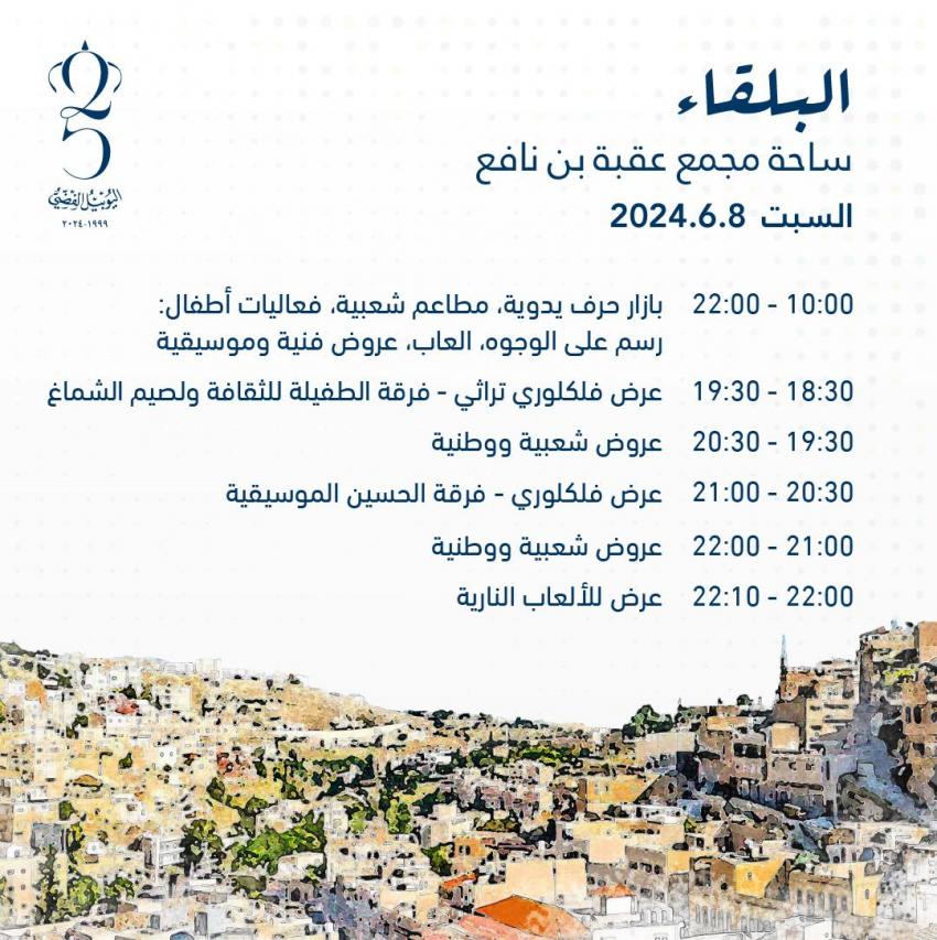 وتبدأ الفعاليات من الساعة 10:00 صباحًا في جميع محافظات المملكة، باستثناء محافظة العقبة، تبدأ الفعاليات من الساعة 6:00 مساءً.