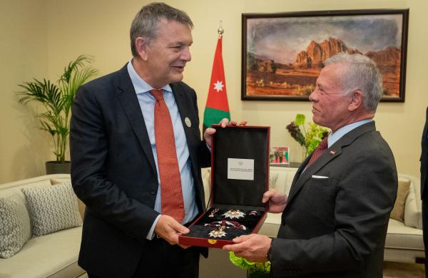 وسلم جلالته الوسام للمفوض العام لوكالة الأونروا فيليب لازاريني، خلال لقائه به على هامش مؤتمر الاستجابة الإنسانية الطارئة في غزة، بحضور سمو الأمير الحسين بن عبدالله الثاني ولي العهد.