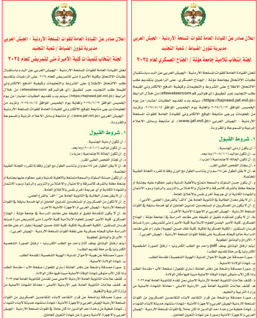 وسيتم بدء تقديم الطلبات اعتبارا من اليوم الخميس الموافق 13/6/2024 ولغاية يوم الخميس الموافق 15/8/2024، وللمزيد من المعلومات يرجى متابعة الموقع الإلكتروني للقيادة العامة للقوات المسلحة الأردنية – الجيش العربي (WWW.JAF.MIL.JO) أو متابعة وسائل الإعلام المرئية والمسموعة و المقروءة .