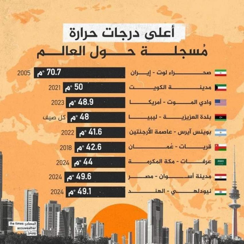 ويظهر الإنفوغراف أدناه اعلى درجات الحرارة المسجلة بالعالم وفي أي سنوات.