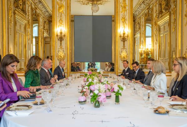 ولدى وصول جلالة الملك، ترافقه جلالة الملكة رانيا العبدالله إلى قصر الإليزيه، كان الرئيس الفرنسي والسيدة عقيلته في مقدمة المستقبلين.