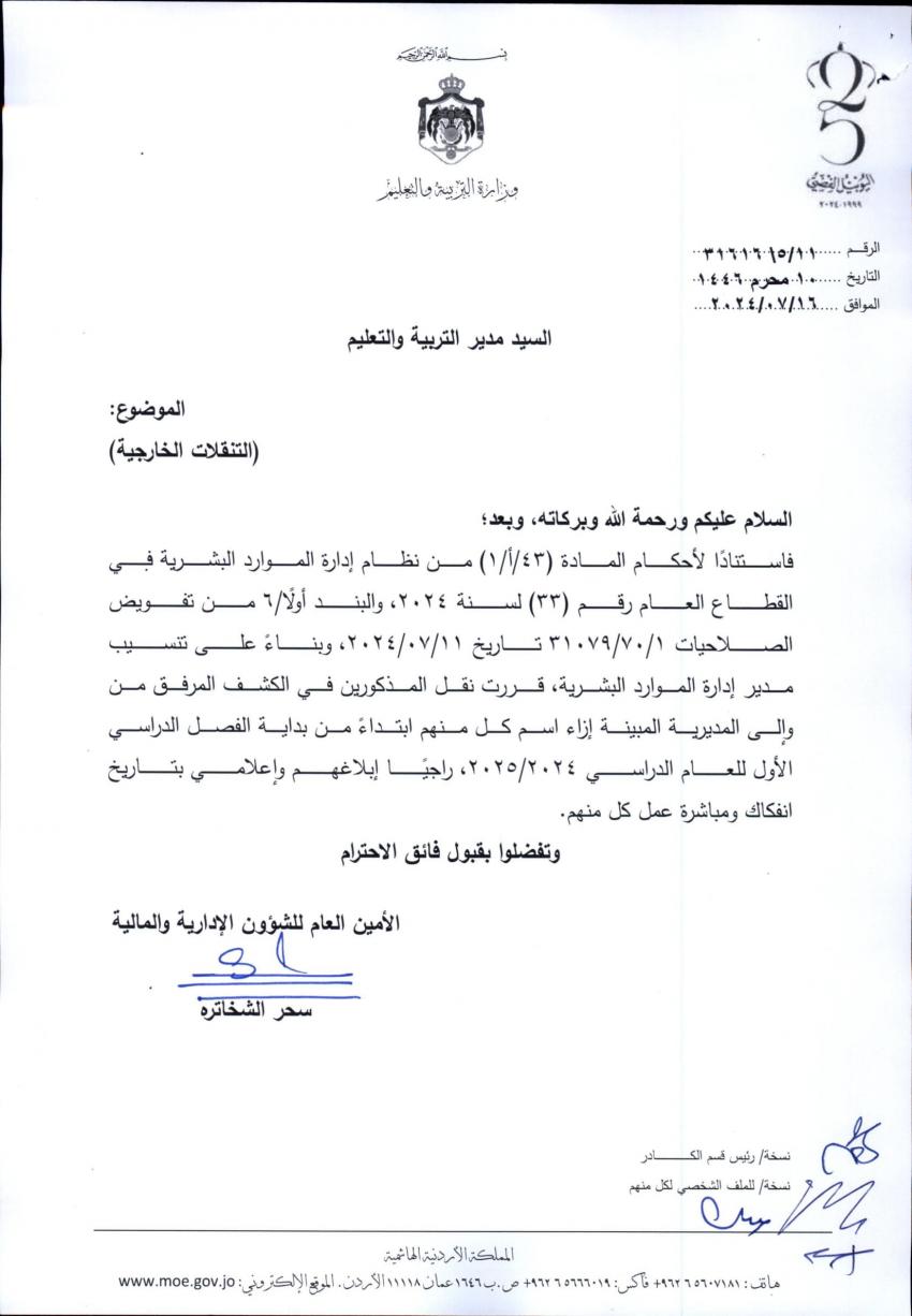 قررت الأمين العام للشؤون الادارية والمالية في وزارة التربية سحر الشخاترة اجراء التنقلات الخارجية التالية للمعلمين والمعلمات اعتبارًا من بداية العام الدراسي المقبل 2024/ 2025.