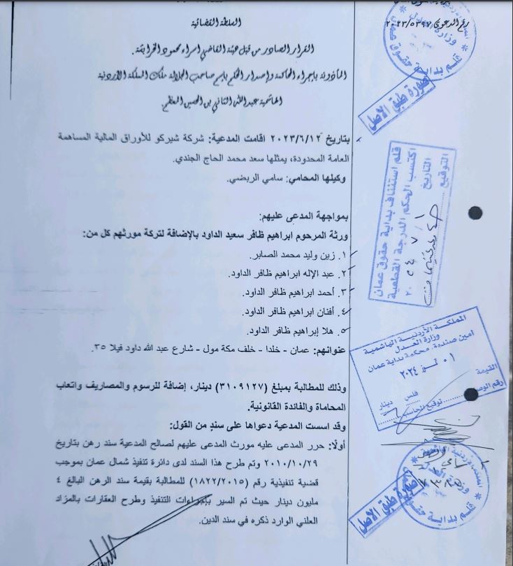 شيركو: الحكم الصادر بإلزام ورثة ابراهيم الداود بدفع 3مليون دينار قرارا قطعياً وغير قابل للطعن .. وثيقة